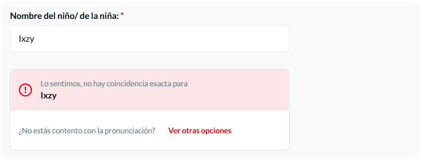 Cuando aparezca el formulario de personalización, introduce el nombre del niño como de costumbre. Si Santa lo reconoce, verás la pronunciación de inmediato. Si no es así, verás un mensaje como este: