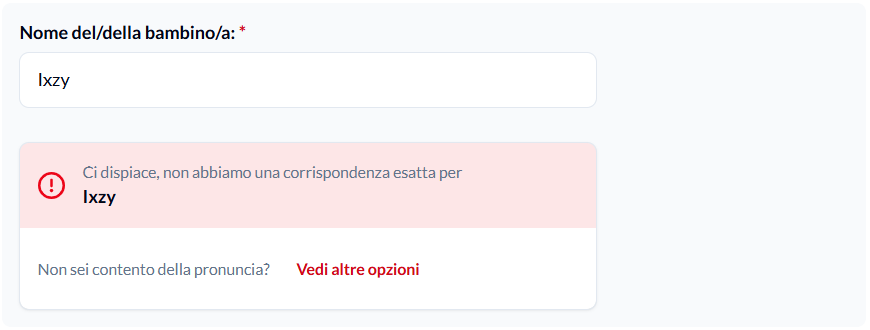 Quando appare il modulo di personalizzazione, inserisci il nome del bambino come al solito. Se Babbo Natale lo riconosce, vedrai subito la pronuncia. In caso contrario, vedrai un messaggio del tipo: